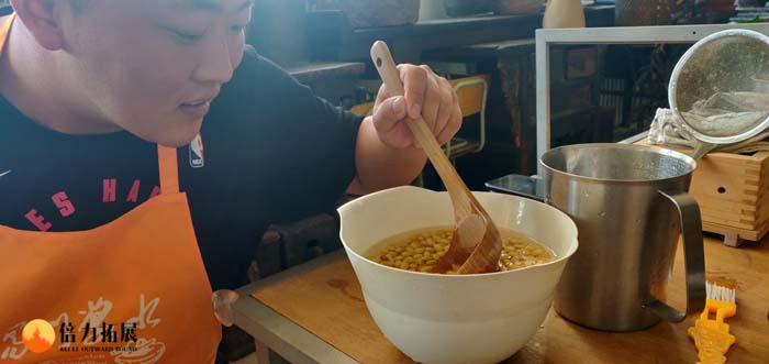 体验亲手把黄豆变成豆浆过程,是神奇而美妙的,在小石磨的旋转下,豆浆慢慢的流淌出来。为什么要用石磨,这中间也有讲究,在磨浆的过程中石磨它速度比较慢,蛋白质释放过程中,营养价值保留的比较好,完整一些,虽然杨门浆水豆腐有很多优点,但其制作技术复杂,需要11道工序,同样用一斤黄豆做法不一样成本与收益相差很多。浆水豆腐最费时、费力、费料并且出豆腐最少,更需要耐心。